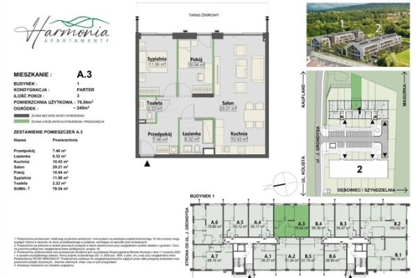 Oferowany lokal mieszkalny nr A.3 o pow. 78,54 mkw., z własnym ogródkiem o pow. ok. 245 mkw. oraz wystawą okien - strona wschodnia, zlokalizowany jest na parterze budynku nr 1